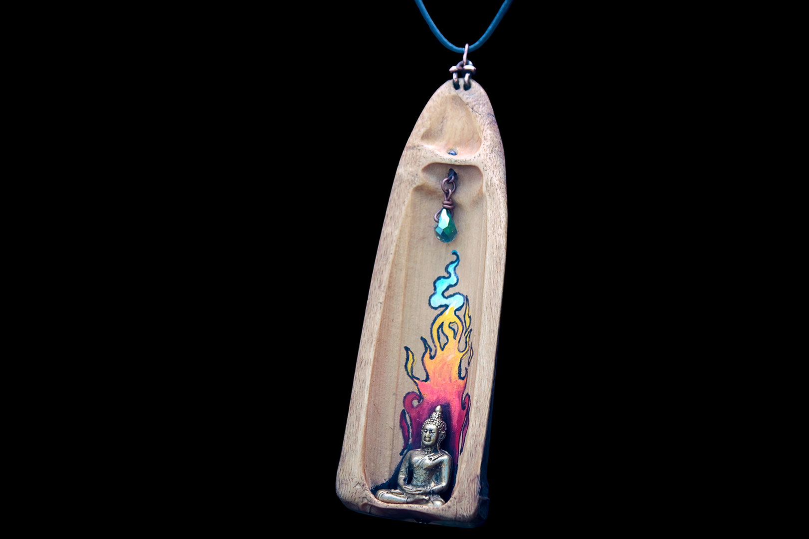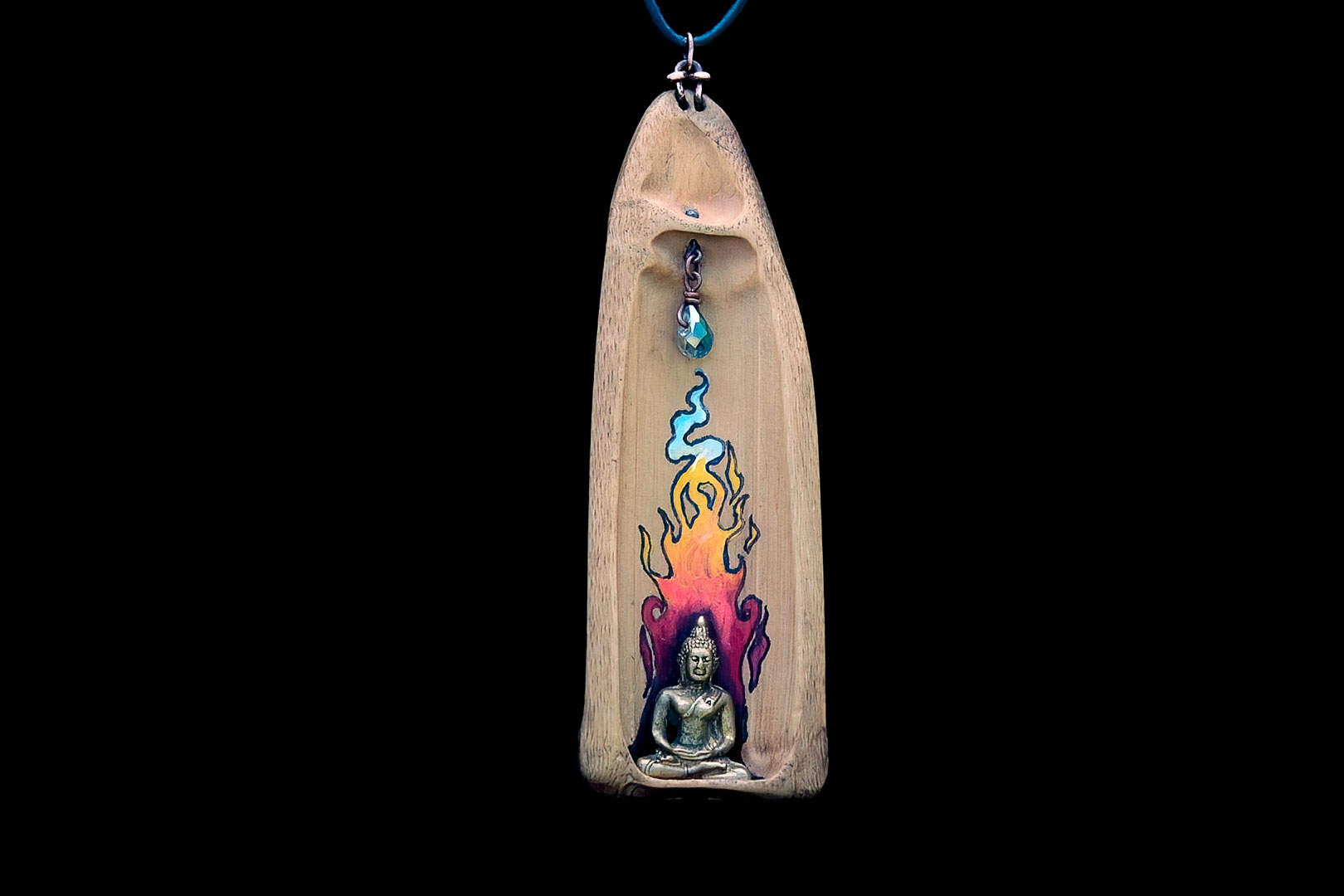 Oh, but the Magic Doesn’t End There! Nestled Upon this Fiery Canvas is a Precious Treasure—a Tiny Bronze Buddha, as Serene as the Gentle Breeze that Whispers Through the Festival Grounds. Held in Place by a Humble Yet Sturdy Watch Screw, this Divine Emblem of Enlightenment Adds an Air of Spirituality to this Captivating Necklace.