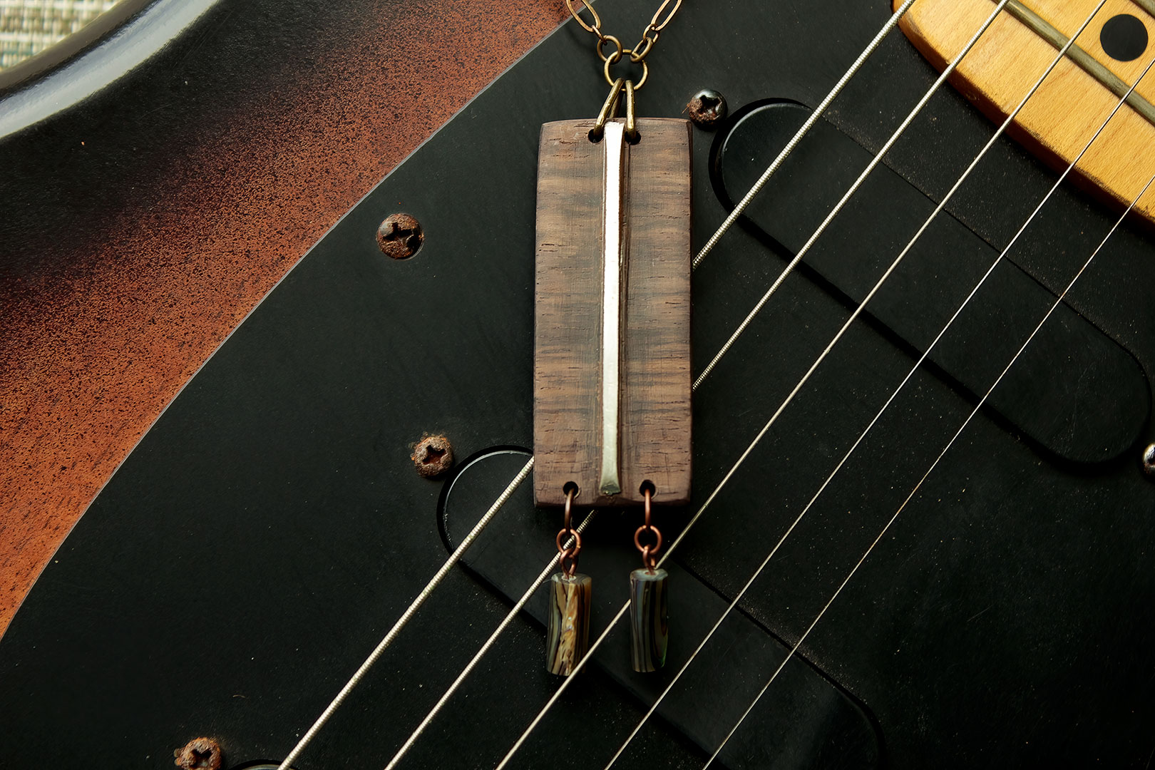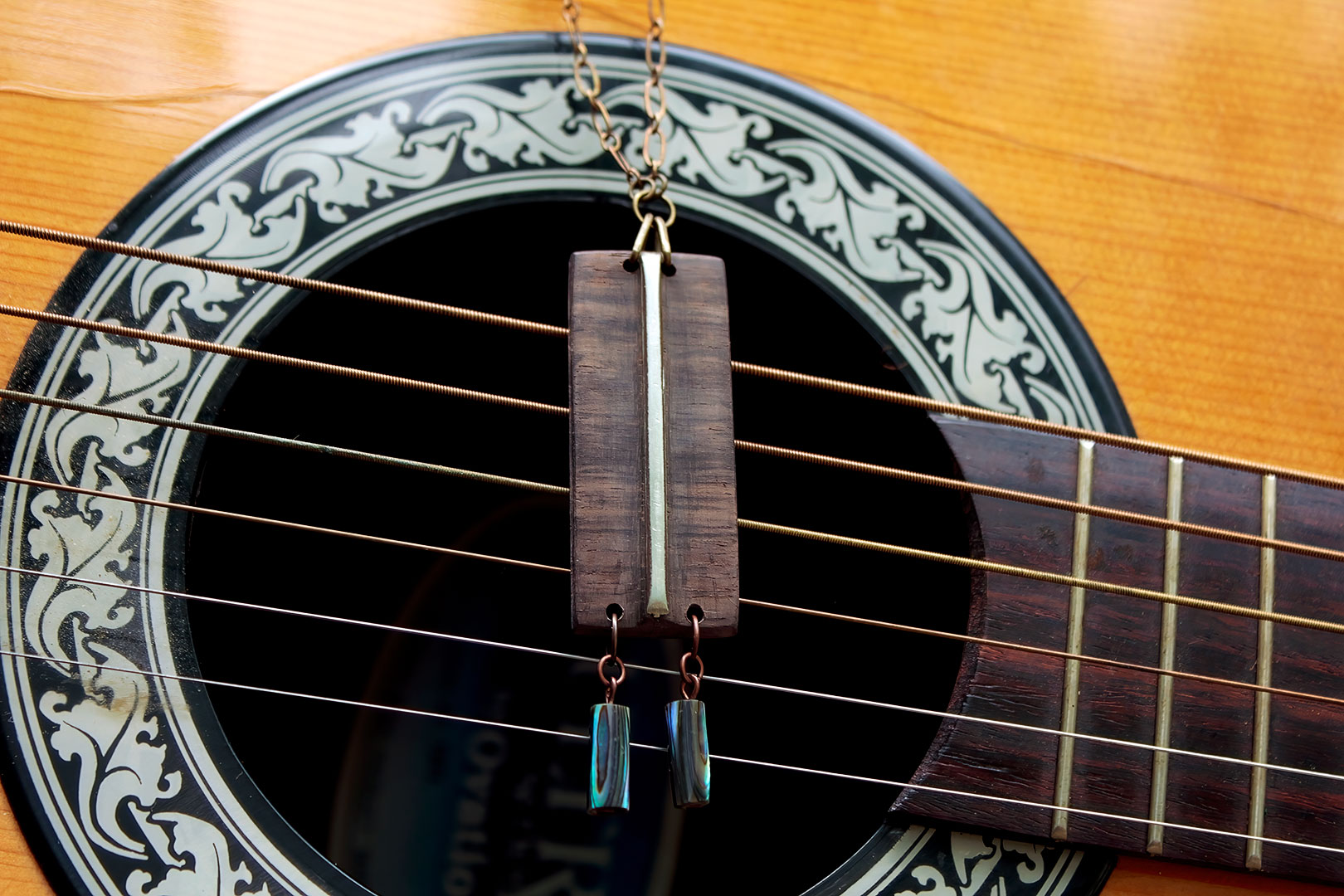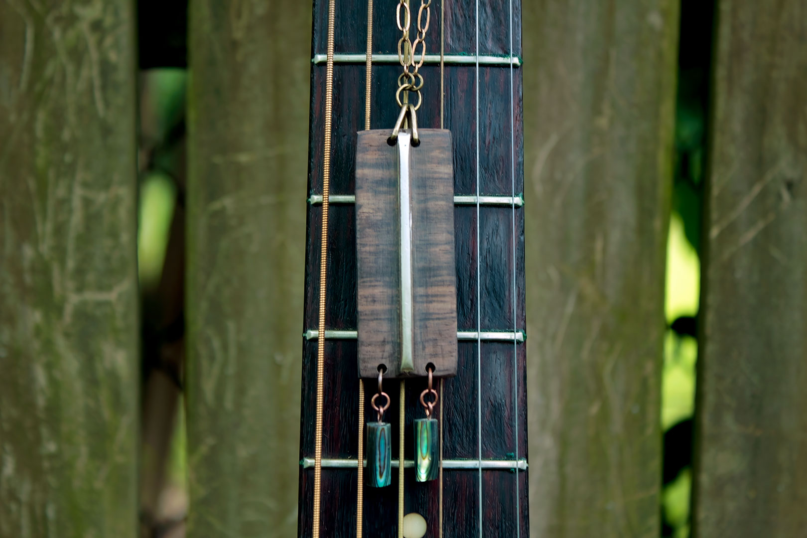 The Fret Board, a Repository of Melodies and Riffs, Sings a Silent Song in this Extraordinary Ensemble. Crafted from Rich Rosewood, its Sleek, Dark Surface is Adorned with the Markings of Countless Musical Journeys. This Fret, Once Guiding Fingers to Evoke Emotion and Ignite Passion, is Now Transformed into an Elegant, Elongated Centerpiece, Embellishing the Wearer’s Neck.