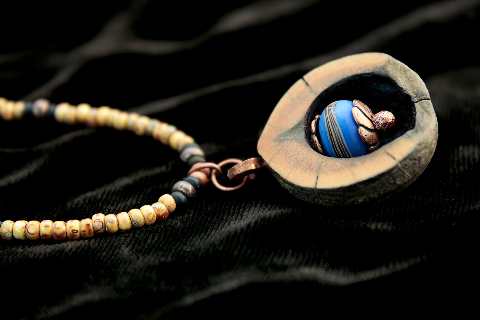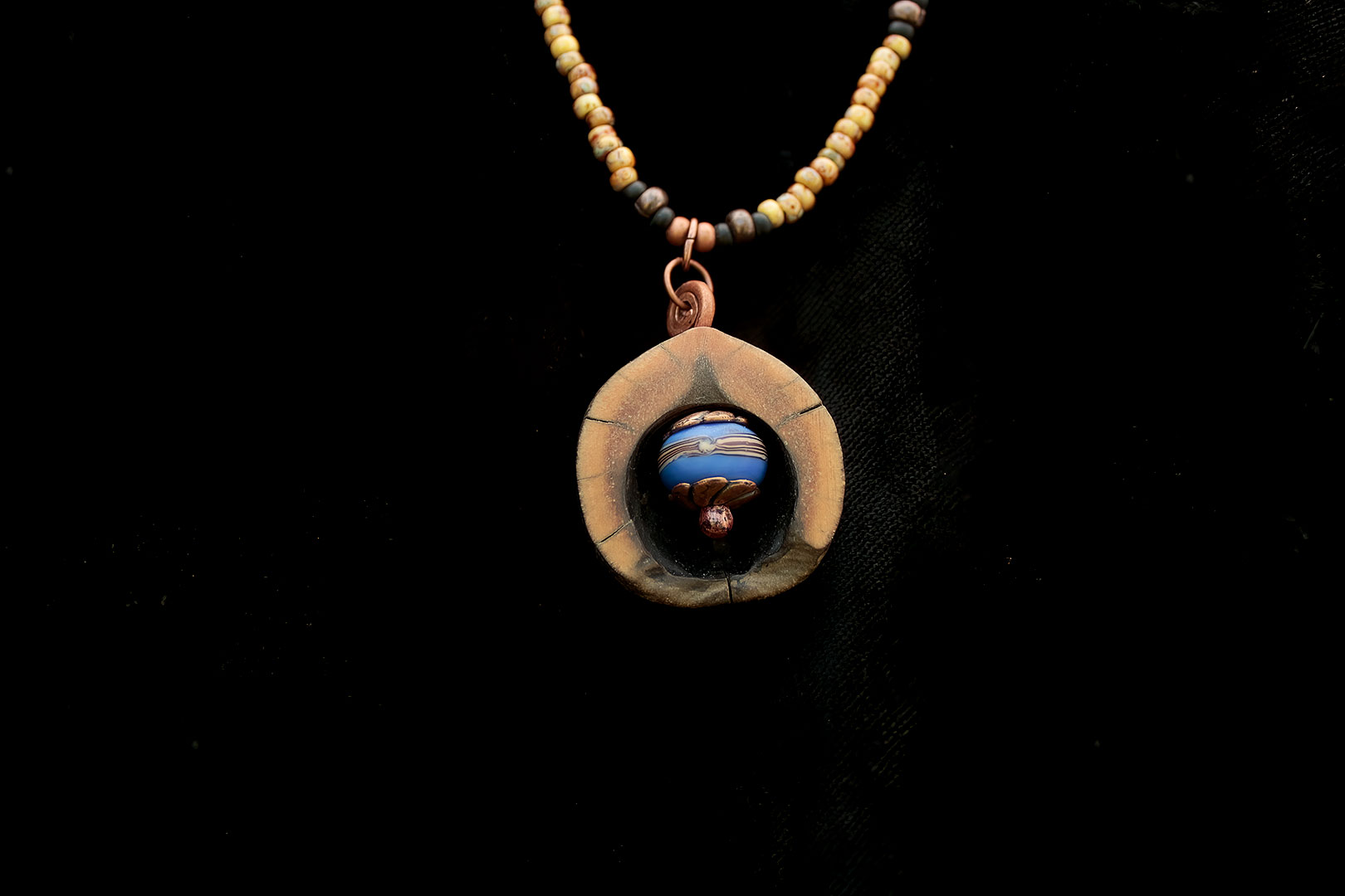 Completing this Spellbinding Creation is a Hand-Forged Copper Bale, Infusing the Design with a Nod to the Primal Craftsmanship of Old. The Sinuous Twists of the Hammered Copper Wire create an Intricate Spiral Along with a Textured Balled Tip to Help Cradle the Venetian Bead, Allowing Them Both to Coexist Harmoniously. Copper, with its Warm Reddish Tones and Natural Patina, Imparts Upon the Necklace a Touch of Rustic Elegance, as if it were Plucked from the Treasures of a Bygone Era.